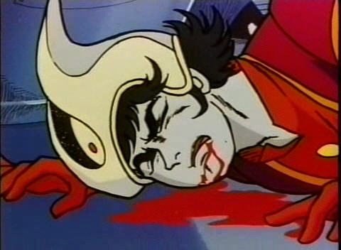 Campione di Formula 1 ma soprattutto uomo con una campana di bronzo nel petto, Hiroshi si trasforma a mezz'aria in una sorta di demone armato di frusta e con i colori del Catanzaro. Giusto perché altrimenti la capa del robot color rosa carne faceva cagare. Una soluzione grafica talmente riuscita, talmente bella-bellissima, che i capetti giapponesi decidono a un certo punto di cambiarla. Venendosene fuori con questa truzzata:![]() |