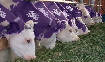 | La batteria di mucche lilla allevate appositamente dalla Milka con un'alimentazione selezionata a base di viole di Bertoloni |