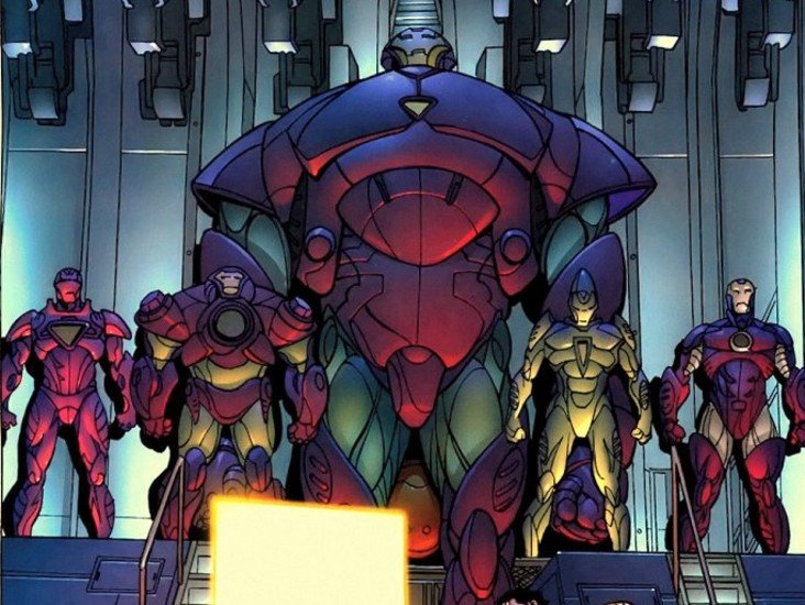 Cinque droni in armatura, una vera e propria squadra di Iron Man sotto il controllo mentale di Tony. Ma hanno fatto molto presto una brutta fine. La formazione includeva: il drone spaziale "Space Ghost" (coast to coast), quello sottomarino e scatena-tsunami "Submariner", l'indistruttibile ma solo sulla carta "Adamantium Man" e "Digger", quel bell'uomo cuore di stagno, burattino da cento tonnellate di vibranio sullo sfondo. Accosciato col pallone "Hulkbuster II", evoluzione della vecchia Hulkbuster (la seconda da sinistra: sì, quella che sembra un Fenomeno verniciato di giallorosso).