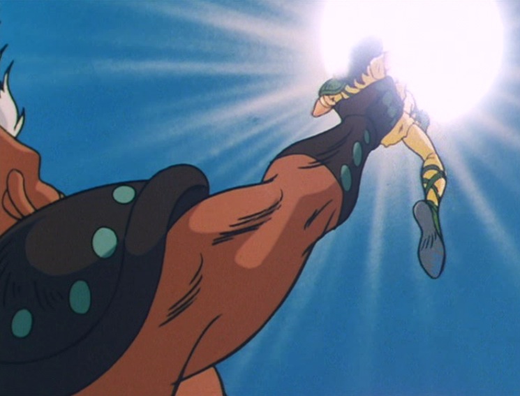 E mentre partono le note da lacrime napulitante di Pegasus Fantasy, si apre lo zainetto da un metro cubo e ne esce l'armatura di Pegasus. Incredibile! L'armatura di Pegasus!, mormora Pegasus, che evidentemente non c'aveva capito ancora una mazza