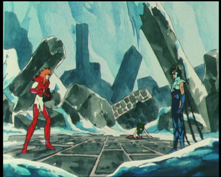 Lo scontro tra il Cavaliere della Fenice e il Cavaliere della Ornella Vanoni, dopo che Andromeda è stato squalificato per manifesta minchionaggine, va avanti con pipponi assurdi, appunto, in un'infinità di primi piani e immagini statiche per sparagnare sulle animazioni.