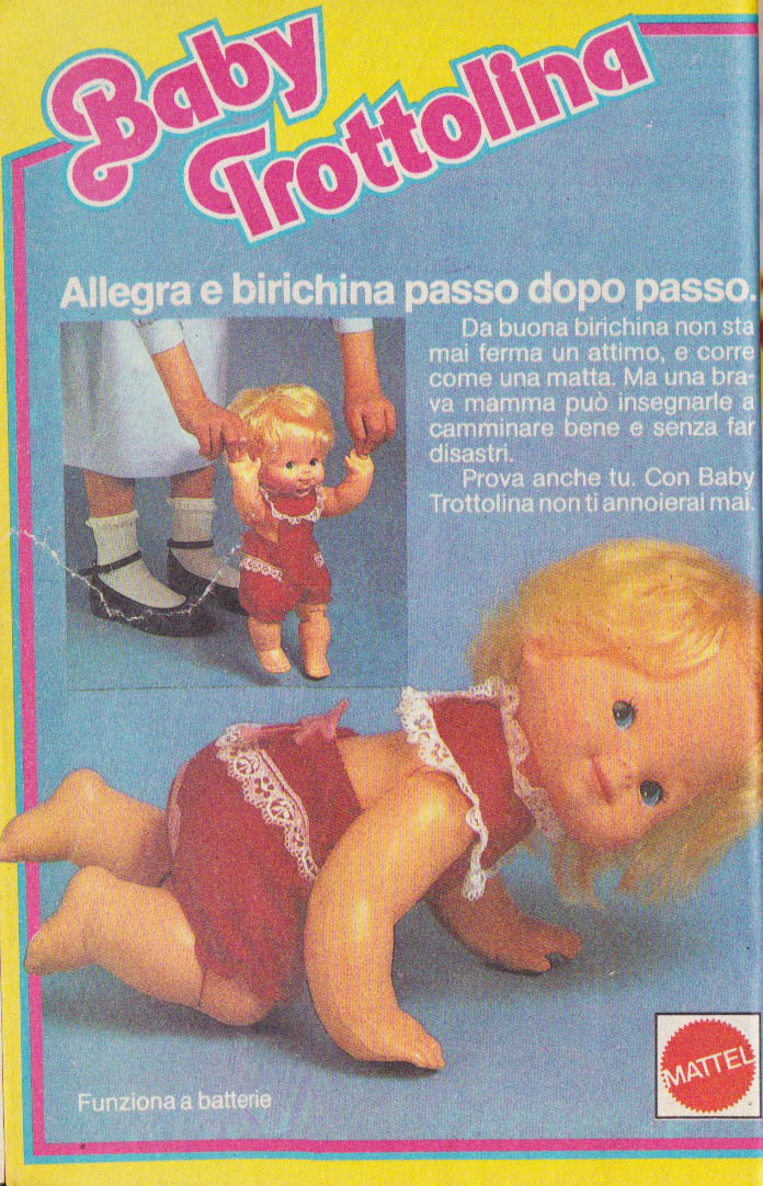 Tolti gli schettini, Baby Skates ti diventa Baby Trottolina, bambola di centrocampo, "allegra e birichina", che "non sta mai ferma un attimo. Ma una buona mamma può insegnarle a camminare bene". Eccola là dietro, la brava mamma, mentre carica un calcioinculo educativo di piatto, pém!
