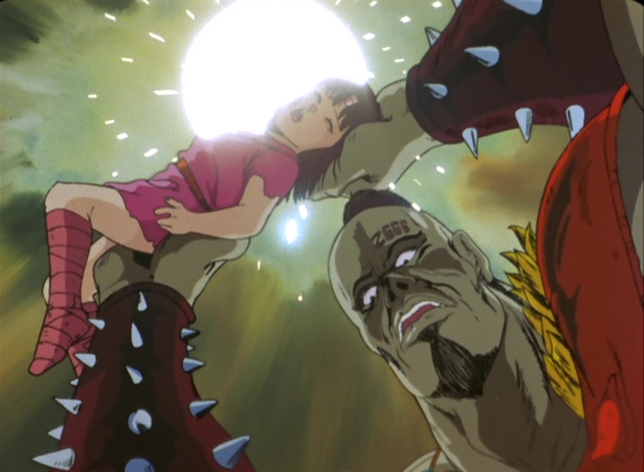 Kenshiro corre fuori e scopre che Zeta ha catturato Lynn e minaccia di aggiderla. Grosso, grosso errore. “Oi Ken, attentu a ‘stu scimmiuni!”, urla la bambina.