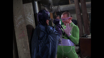 Riddler, che sa tutto perché ha letto il copione, ordina a Molly di indossare il casco, perché Batman sta per colpirli con il Bat-Raggio,